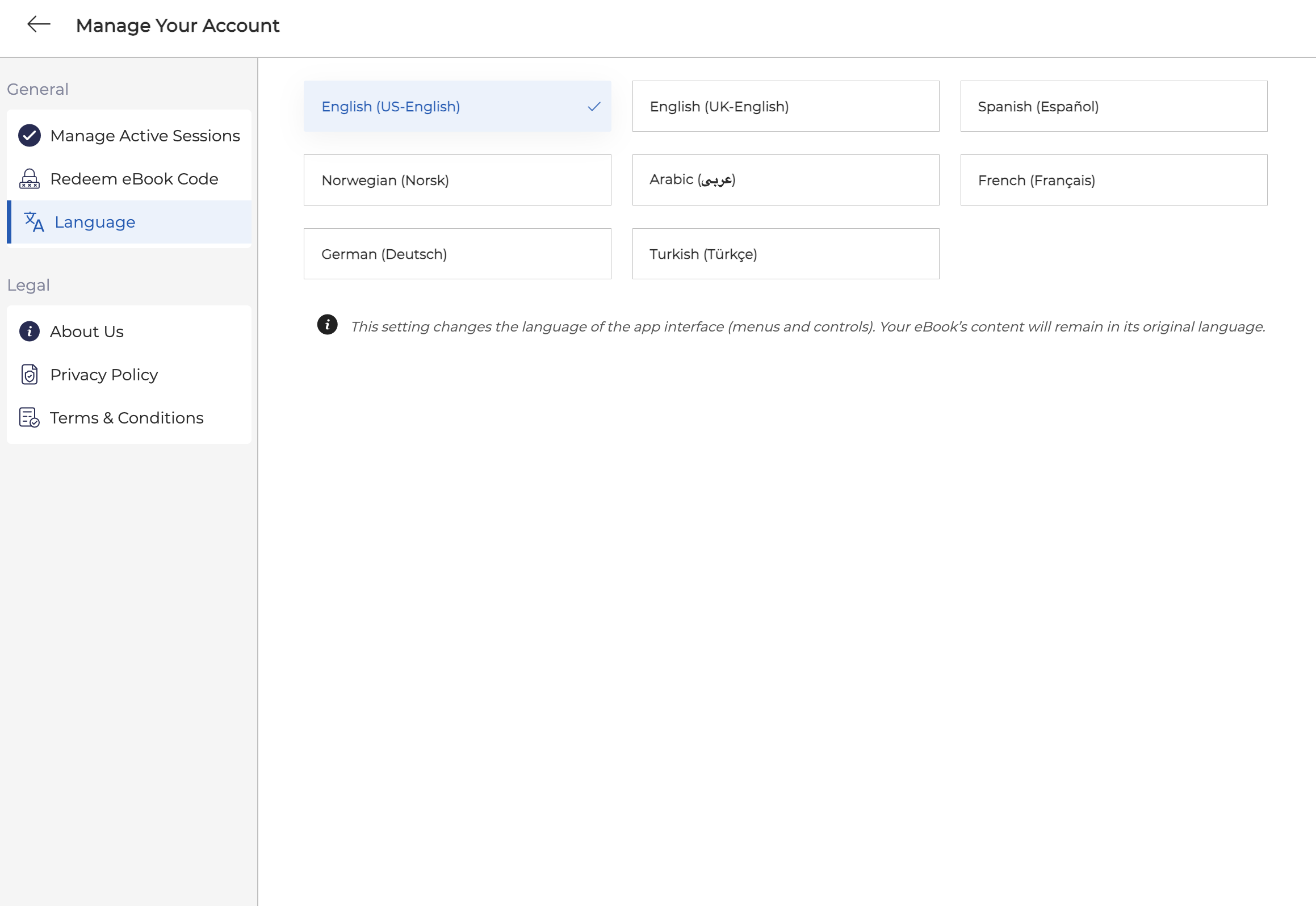 From your bookshelf, tap the Profile Settings icon to open a panel where you can access your account settings. In this panel, you’ll see options like: